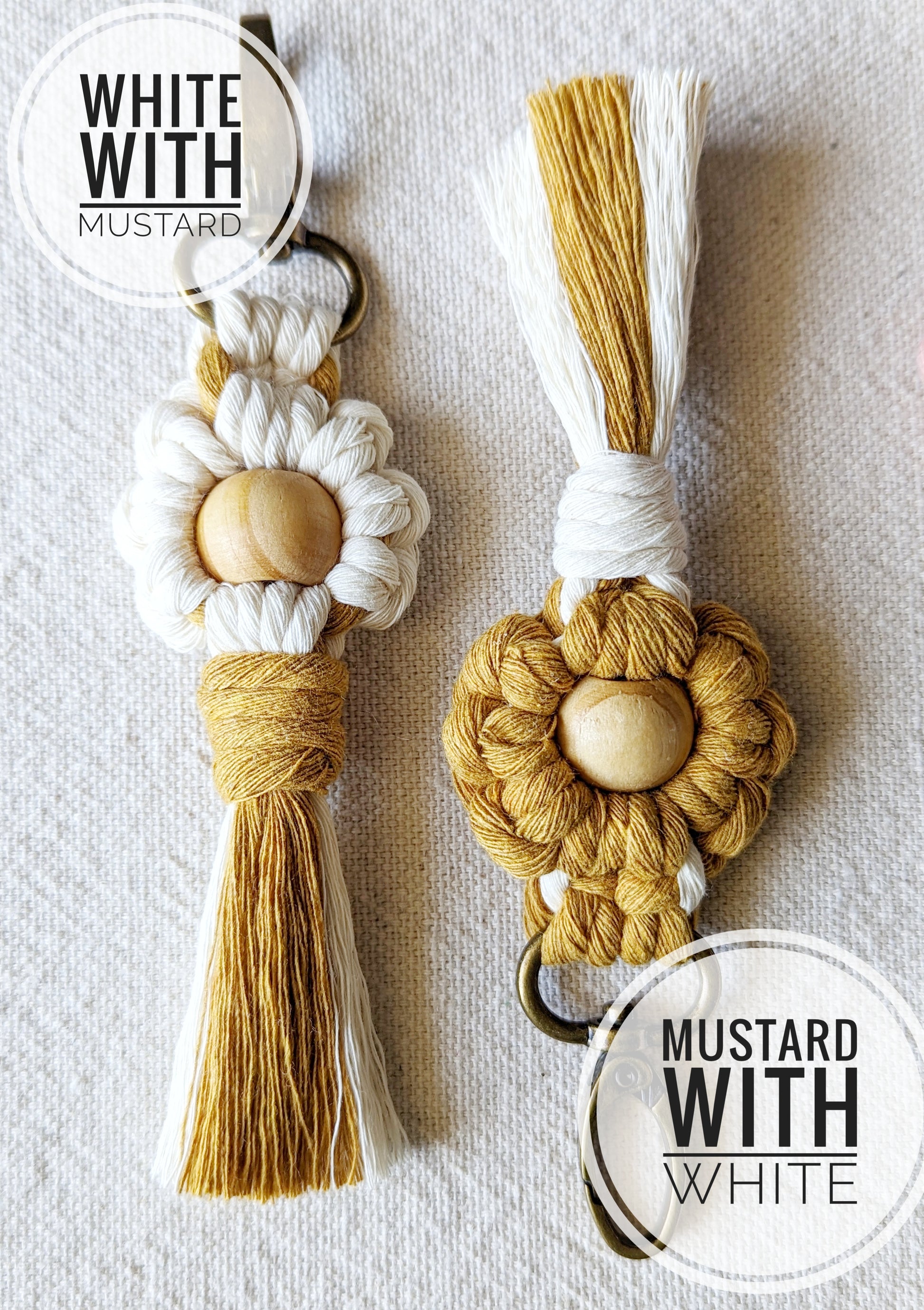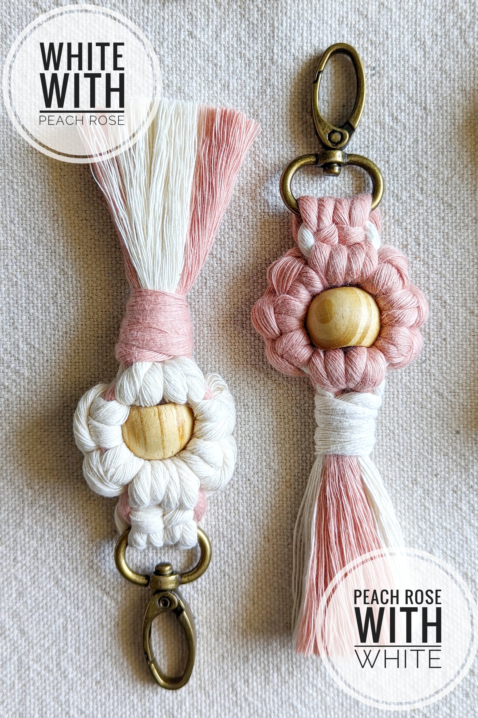 Macrame Daisy Keychain with wood bead and tassel