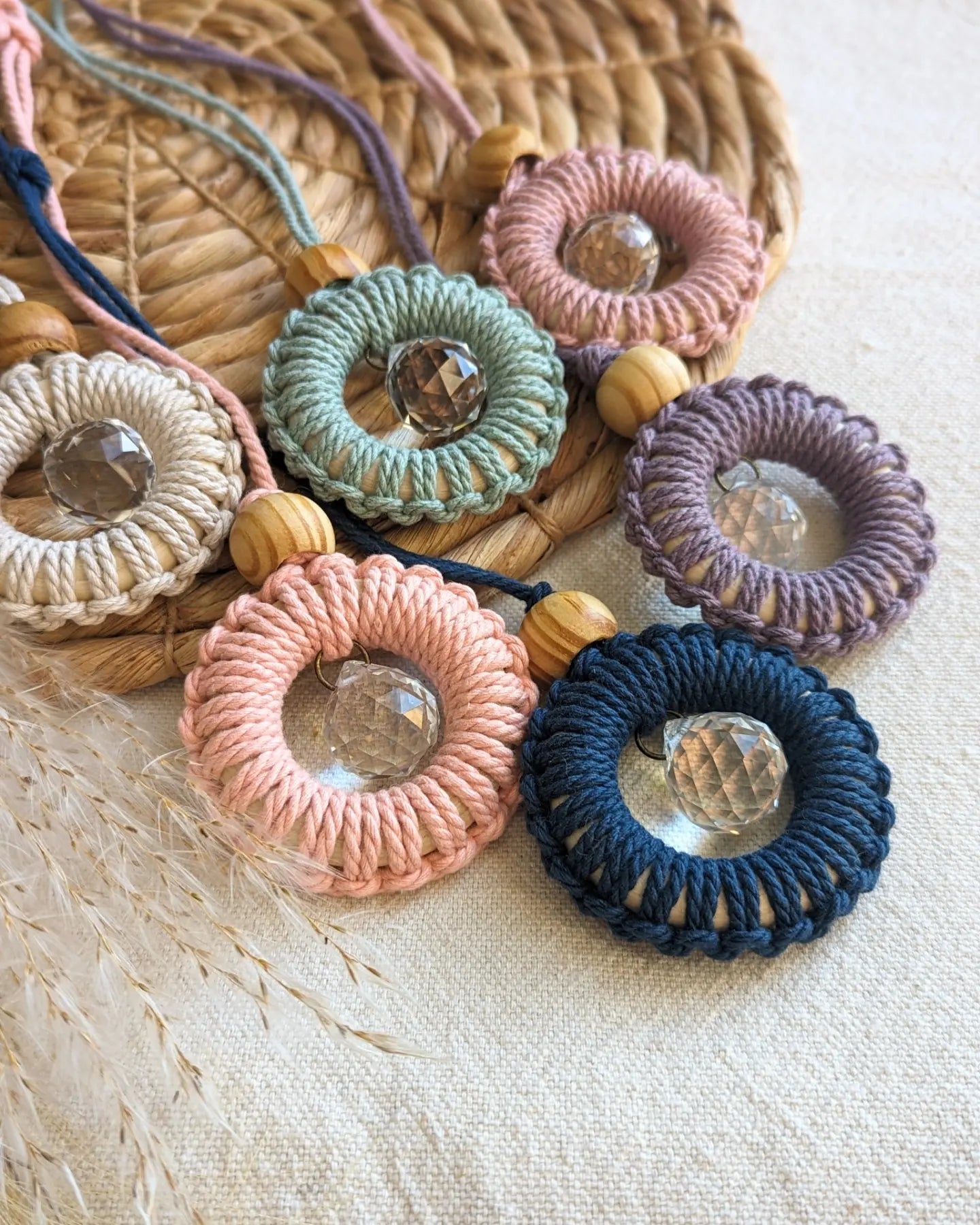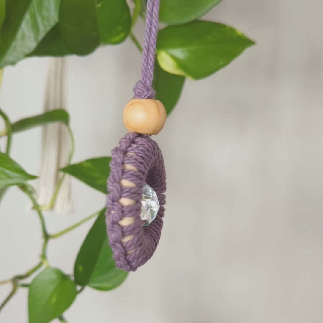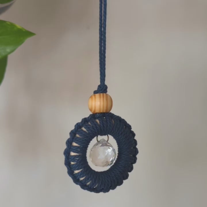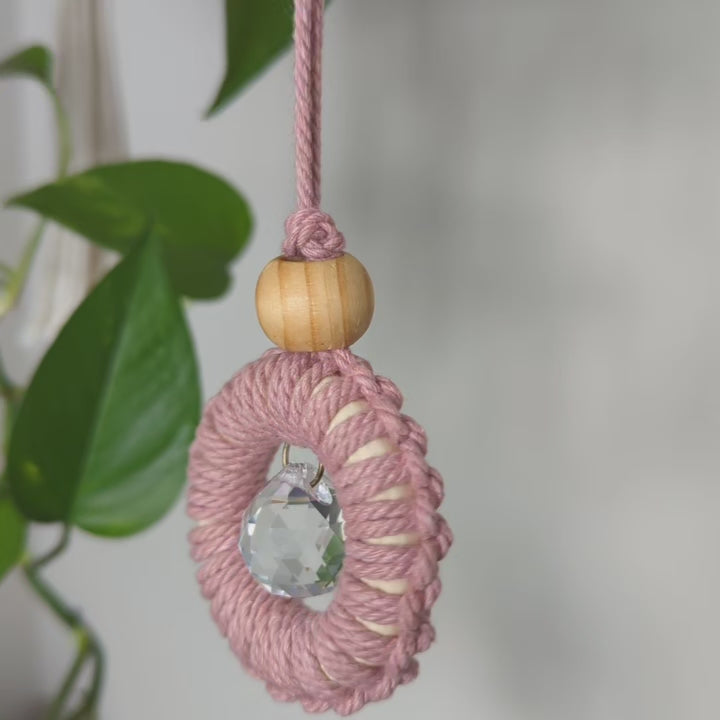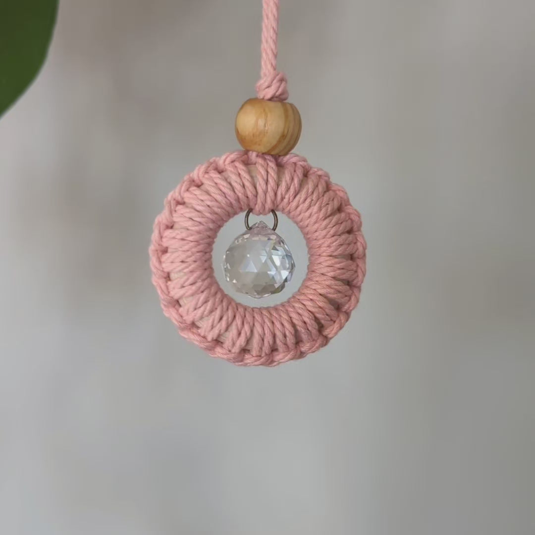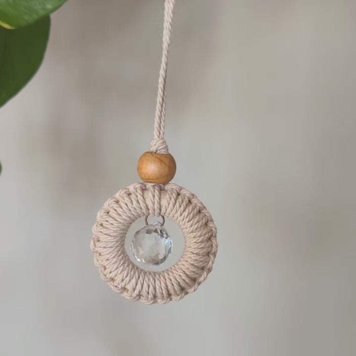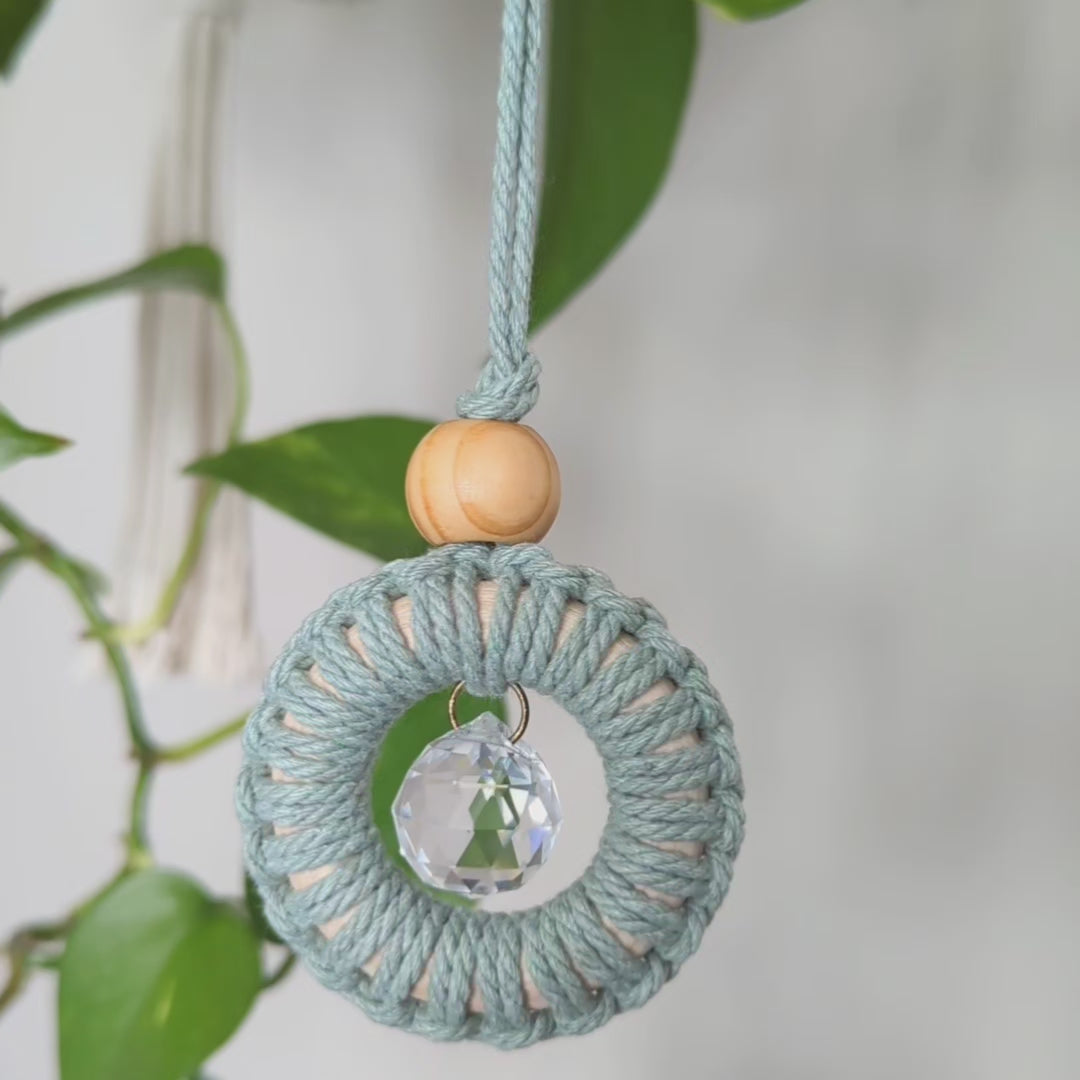 The macrame design around a wooden ring gives this car charm a unique and bohemian look. So easy to use! Simply use the long ties to secure to your rear-view mirror. The sun-catching prism crystal in the center adds a dazzling sparkle, making these car accessories so unique and beautiful. Perfect for gifting!