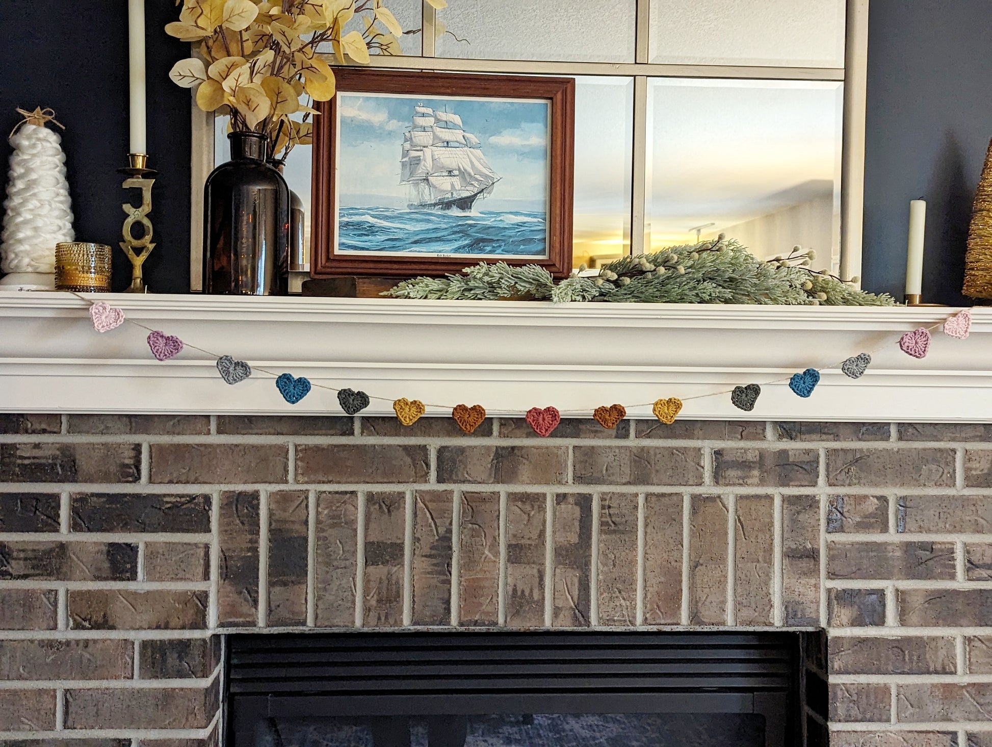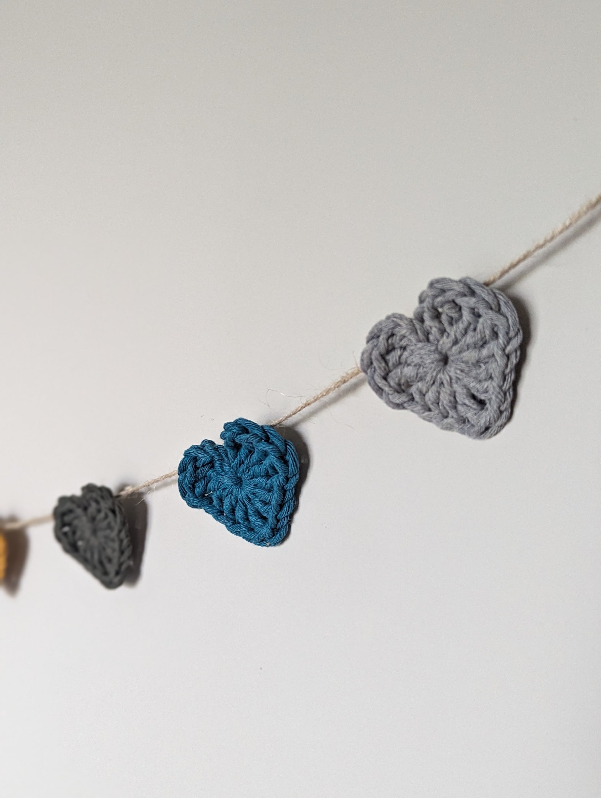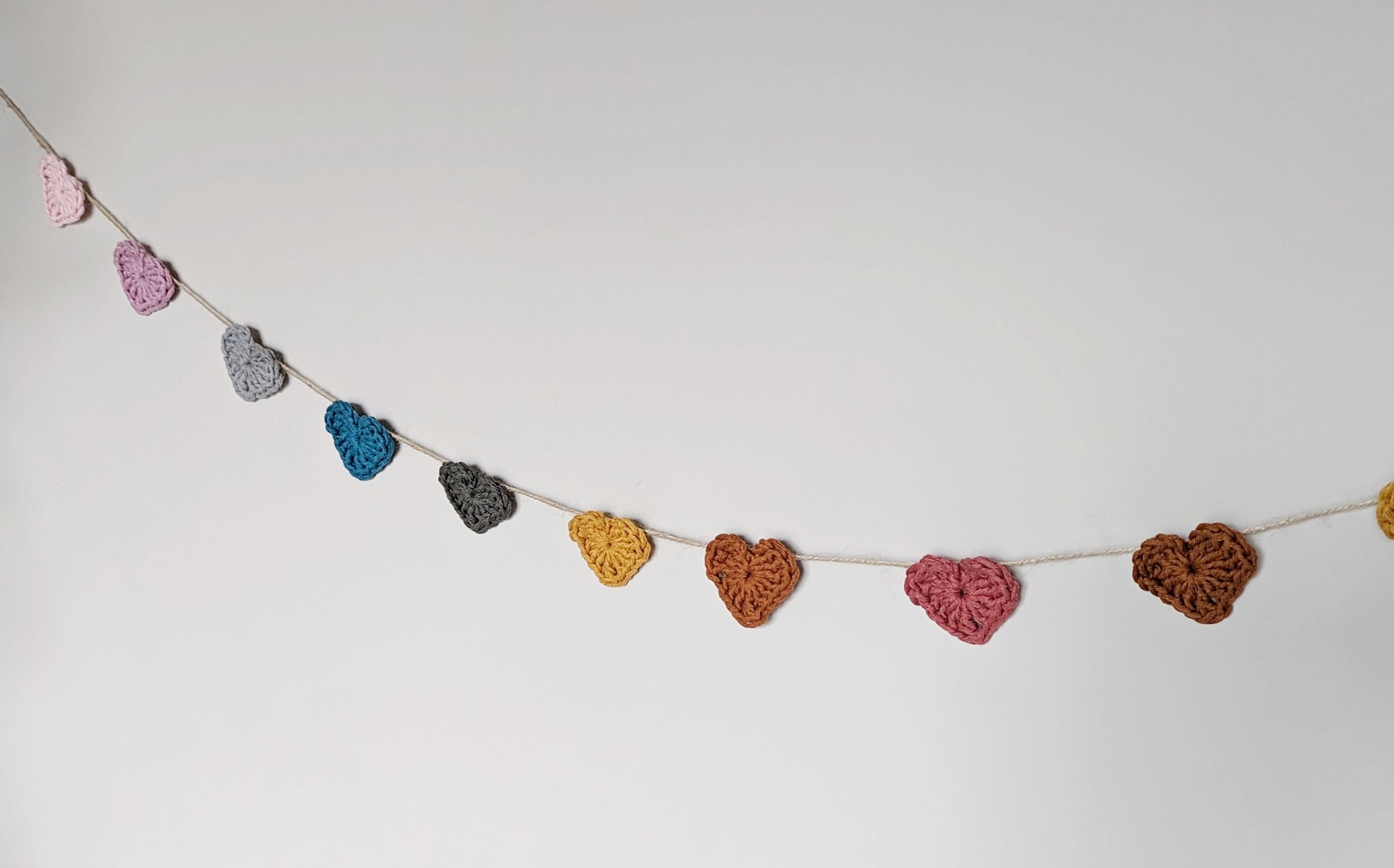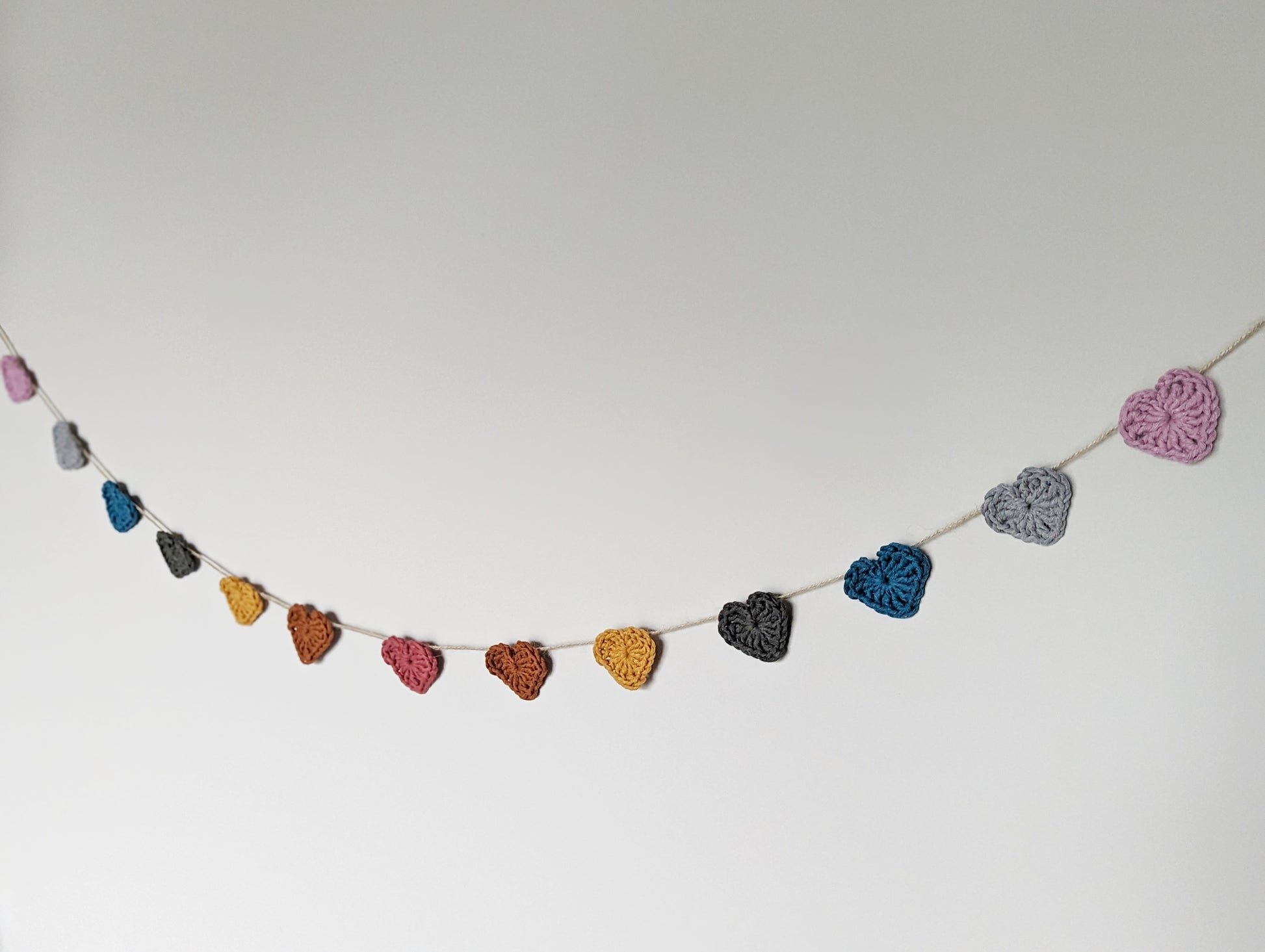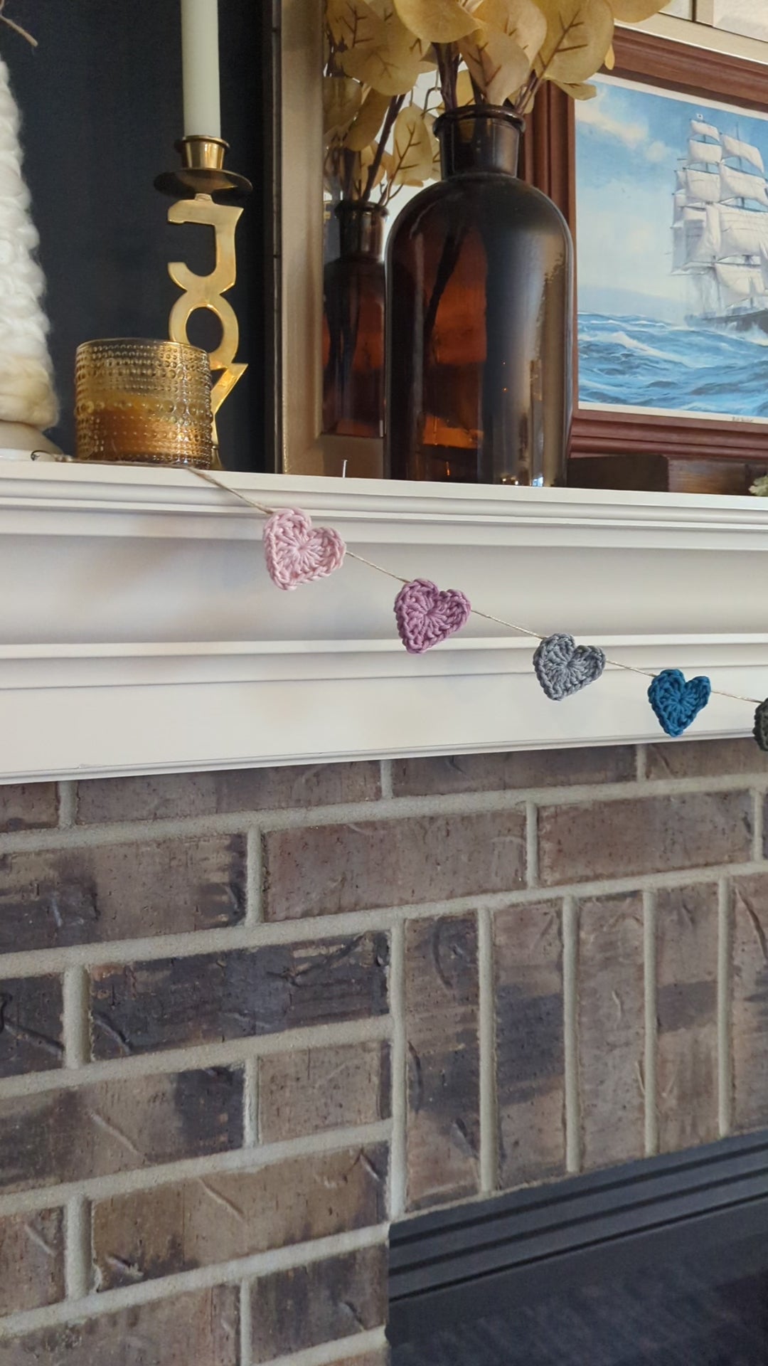 Includes 15 handmade crochet hearts on a jute cord. The ends have a small hoop to make hanging a breeze.